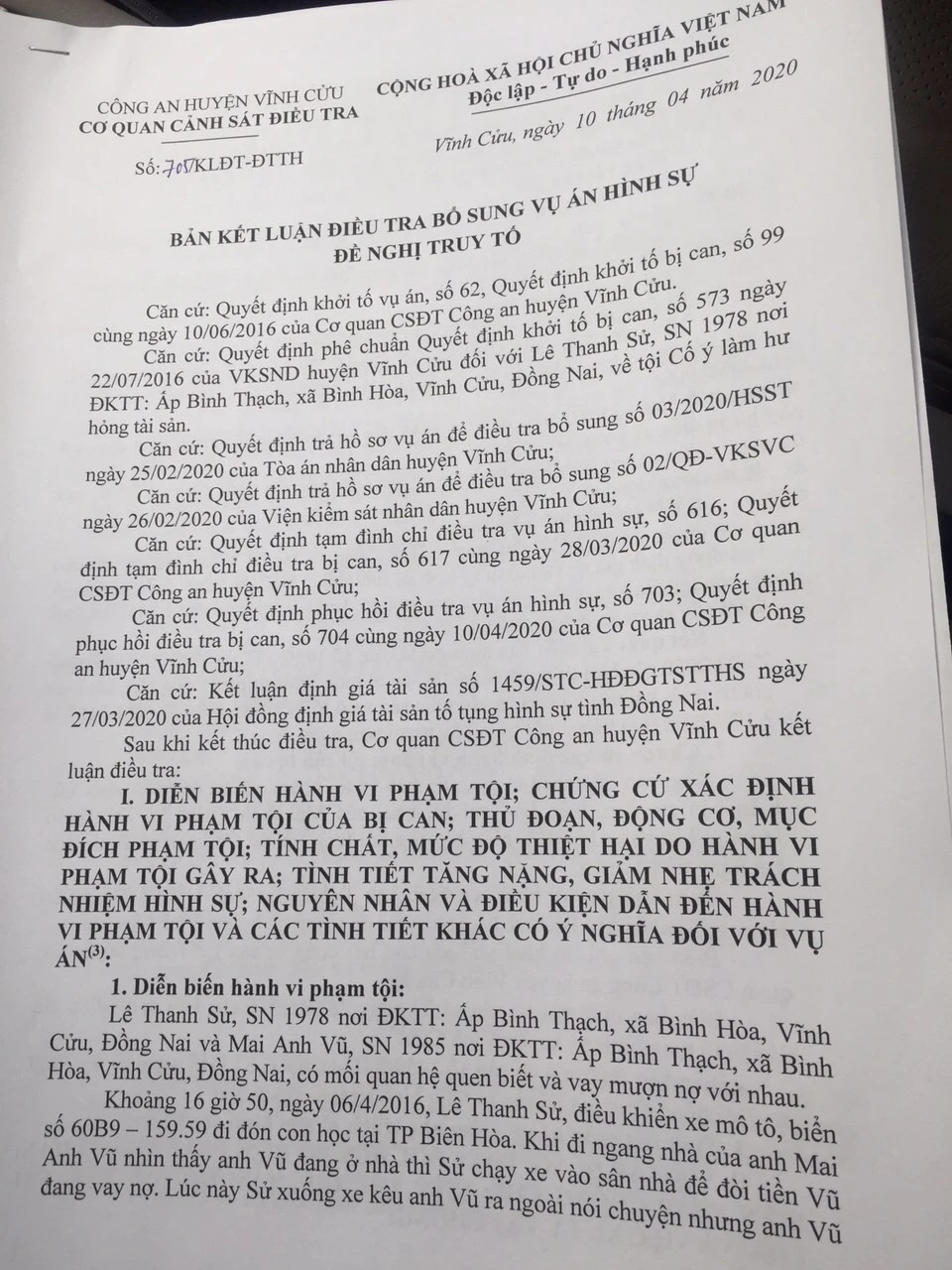 Kết luận điều tra đối với bị can Sử. Ảnh: MV