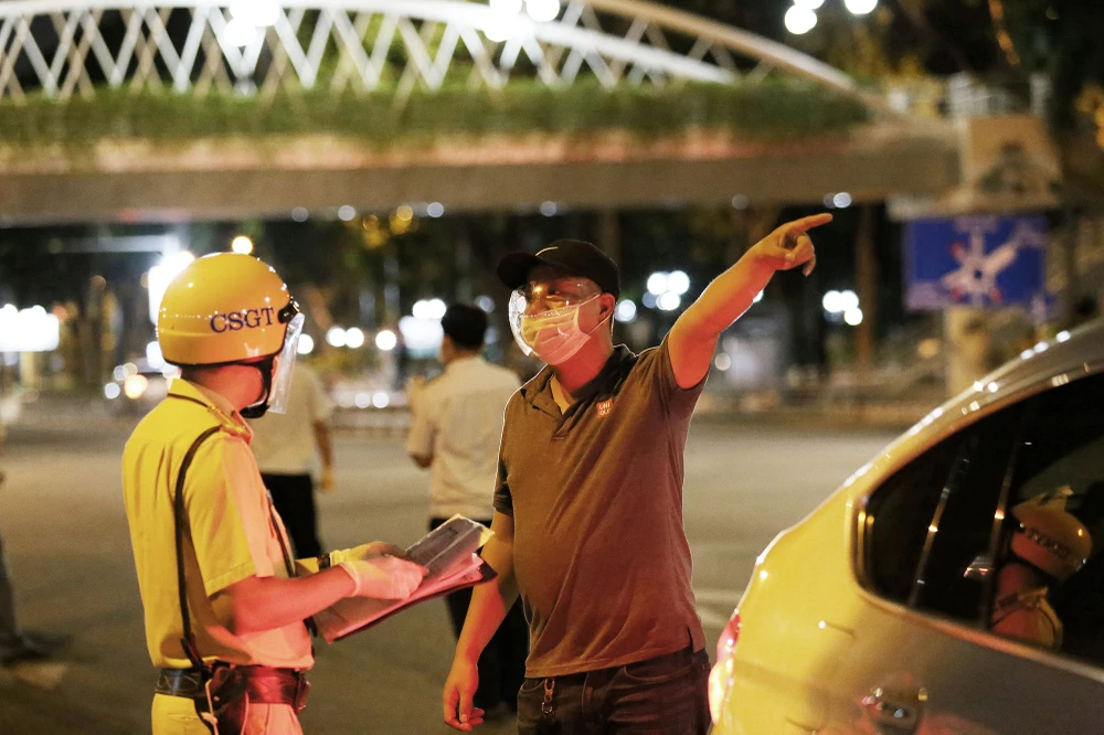 19 giờ 12, tổ công tác kiểm tra đối với một ô tô con và được một người trong xe báo lý do ra đường là để đi mua thuốc. Tuy nhiên, trên xe lại có đến 4 người cùng di chuyển. CSGT yêu cầu lái xe chứng minh việc đi mua thuốc nhưng người này không thể chứng minh. Sau đó, CSGT đã xử phạt lái xe về hành vi ra đường không có lý do chính đáng, tạm giữ GPLX của người này.