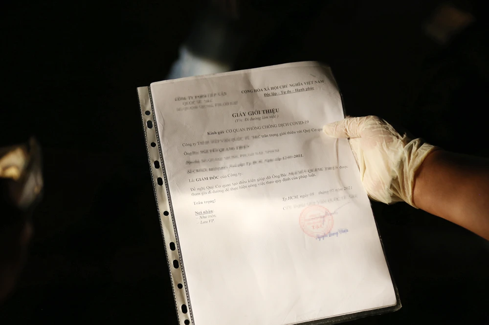 Giấy xác nhận công việc của người dân làm trong các ngành hàng thiết yếu được phép di chuyển. Ảnh: HOÀNG GIANG