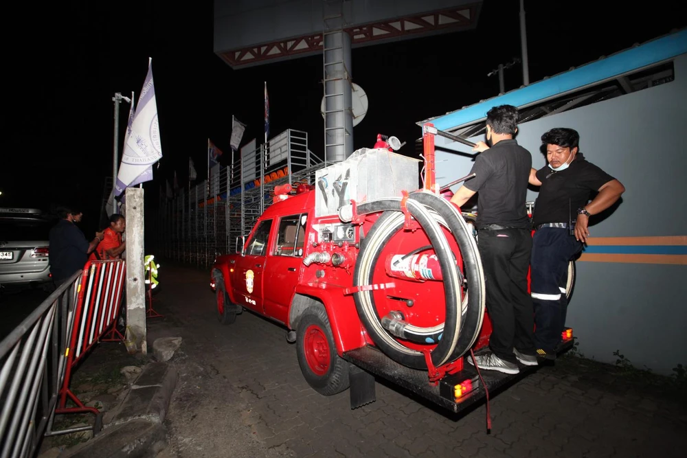Tổ điện lực khắc phục sự cố cúp điện hôm chủ nhật vừa qua tại sân vận động PAT, nhưng bất thành. Ảnh: Bangkok Post