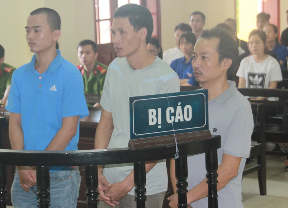 Ba bị cáo Trọng, Hương, Hải đứng trước vành móng ngựa tại phiên tòa sơ thẩm.