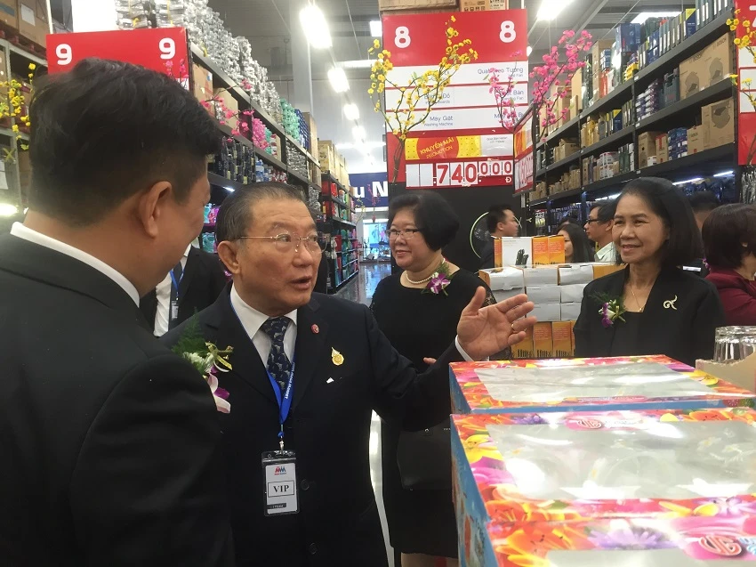 Tỉ phú Thái Charoen Sirivadhanabakdi (bên phải ảnh), người đã chi gần 5 tỉ USD mua cổ phần Bia Sài Gòn thông qua Công ty TNHH Vietnam Beverage, trong một lần thăm, khảo sát Siêu thị Metro (nay đổi tên thành MM Mega Market). Ảnh: TÚ UYÊN