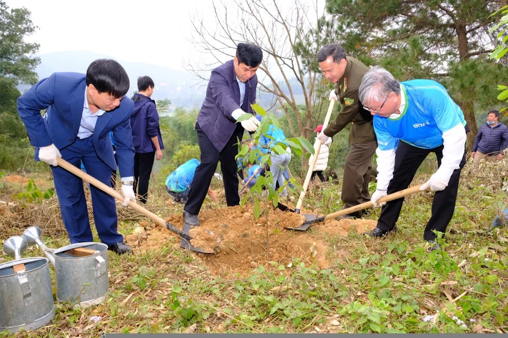 Lãnh đạo BIDV cùng lãnh đạo xã Khánh Thượng, lãnh đạo Vườn quốc gia Ba Vì thực hiện trồng những cây xanh đầu tiên