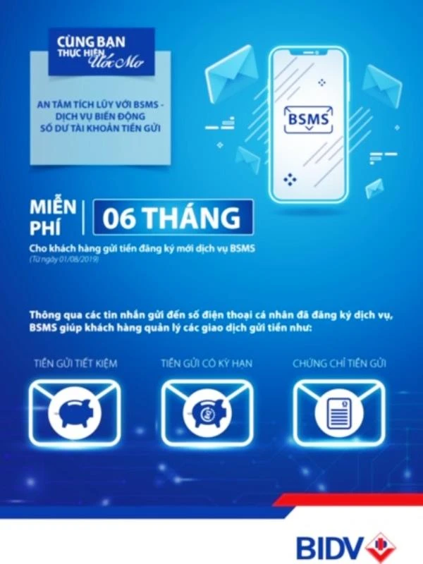Với mong muốn giúp khách hàng quản lý tài khoản tiền gửi có kỳ hạn mọi lúc, mọi nơi và gia tăng tối đa tiện ích sử dụng dịch vụ, BIDV gửi tặng sáu tháng miễn phí dịch vụ BSMS cho khách hàng cá nhân gửi tiền gửi có kỳ hạn và đăng ký mới dịch vụ BSMS, áp dụng từ ngày 1-8.