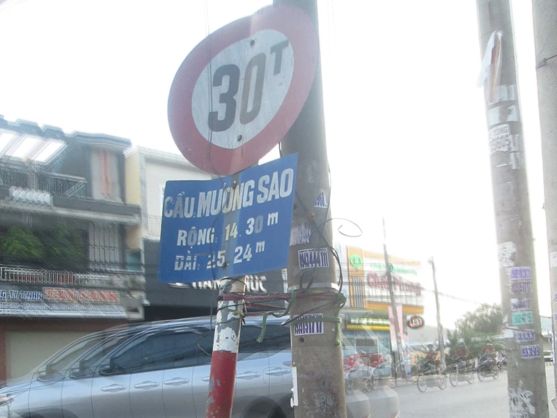 Trên đường Phạm Văn Thuận (cạnh cầu Mương Sao), khu phố 2, phường Tân Tiến, TP Biên Hòa, Đồng Nai có biển báo không có chân được buộc vào trụ cáp.