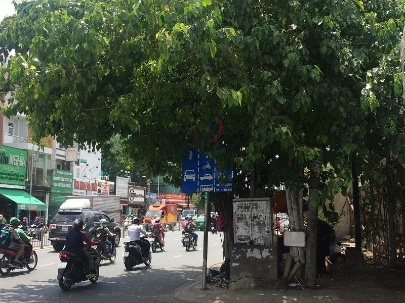 Biển báo bị che khuất bởi các tán cây um tùm trên tuyến đường Bạch Đằng, quận Bình Thạnh.