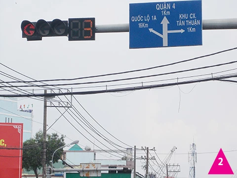 Thế nhưng chỉ cách vài chục mét lên sát ngã ba, trên cần vươn gắn đèn xanh - vàng - đỏ lại có tấm biển khác chỉ dẫn hướng đi thẳng qua quận 4 và rẽ trái theo đường Nguyễn Văn Linh ra quốc lộ 1 (ảnh 2).