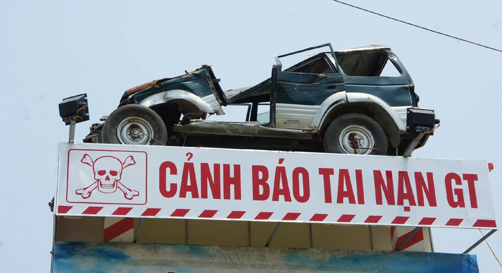 Biển cảnh báo tai nạn giao thông bằng ô tô con hư hỏng do bị tai nạn được ông Nguyễn Tiến Định dựng lên bên quốc lộ 1A và đường sắt Bắc-Nam.