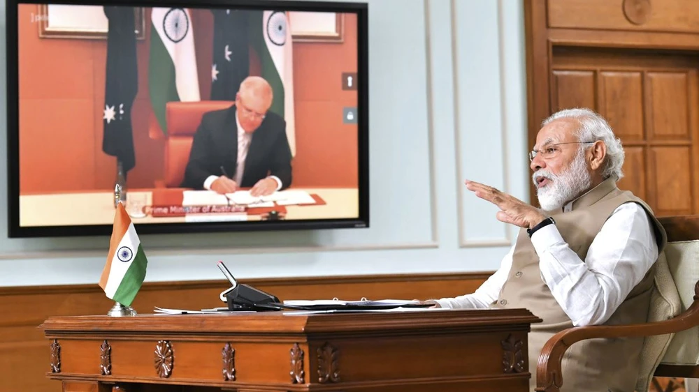 Thủ tướng Ấn Độ Narendra Modi (phải) trong hội nghị trực tuyến với người đồng cấp Úc Scott Morrison (trái) ngày 4-6. Ảnh: CNN