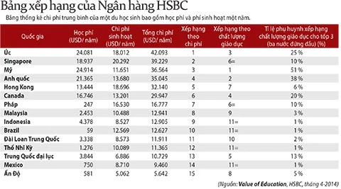 Nghiên cứu của Ngân hàng HSBC đồng thời cũng đã lấy ý kiến thăm dò từ hơn 4.500 phụ huynh về chất lượng giáo dục tại các nước nói trên. Theo đó, Mỹ có nền giáo dục đại học tốt nhất (51% đồng ý), kế đến là Anh (38%) và Đức (27%). Nghiên cứu này cũng đã đánh giá cao các nước châu Á và các nước có nền kinh tế mới nổi như Malaysia, Indonesia, Brazil, Đài Loan Trung Quốc, Thổ Nhĩ Kỳ, Trung Quốc đại lục, Mexico, Ấn Độ. Một vài nước trong số này dạy tốt nhưng chi phí vẫn còn giữ ở mức “mềm”. Chẳng hạn, tại Malaysia, tổng chi phí cho một năm học là gần 13.000 USD, còn tại Ấn Độ thì du học sinh chỉ tốn gần 6.000 USD.