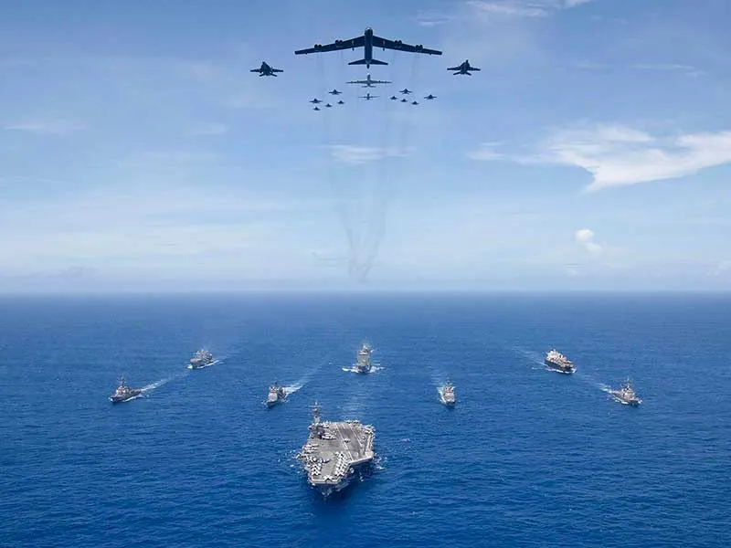Đội hình tàu chiến Mỹ trong tập trận quy mô lớn Valiant Shield 2018 gần đảo Guam phía Tây Thái Bình Dương. Ảnh: BỘ NGOẠI GIAO MỸ