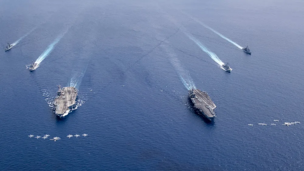 Nhóm tác chiến tàu sân bay USS Nimitz và USS Ronald Reagon tập trận kép tại Biển Đông hồi tháng 7-2020. Ảnh: HẢI QUÂN MỸ