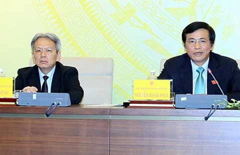 Chủ nhiệm VPQH Nguyễn Hạnh Phúc (phải) và Phó Chủ nhiệm VPQH Nguyễn Sĩ Dũng tại cuộc họp báo. Ảnh: TTXVN