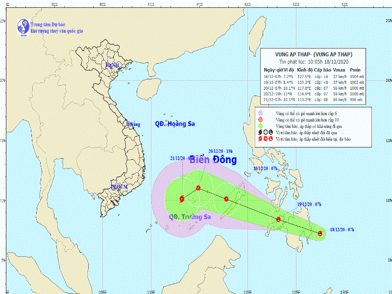 Đến 7 giờ ngày 20-12, vị trí tâm ATNĐ ở khoảng 10,1 độ Vĩ Bắc; 117,8 độ Kinh Đông, cách đảo Song Tử Tây (quần đảo Trường Sa) khoảng 400 km về phía Đông Đông Nam. Sức gió mạnh nhất vùng gần tâm ATNĐ mạnh cấp 6-7 (40-60 km/giờ), giật cấp 9.