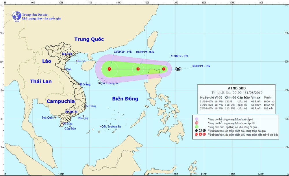 Dự báo đến 7 giờ ngày 1-9, vị trí tâm ATNĐ cách quần đảo Hoàng Sa khoảng 770 km về phía đông đông bắc. Sức gió mạnh nhất vùng gần tâm ATNĐ mạnh cấp 6-7 (40-60 km/giờ), giật cấp 9.