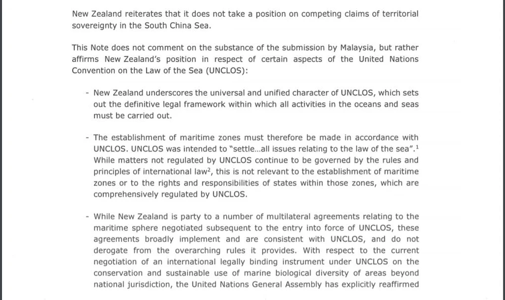 Trích công hàm New Zealand gửi lên Liên Hợp Quốc, tuyên bố ủng hộ UNCLOS. Ảnh chụp màn hình