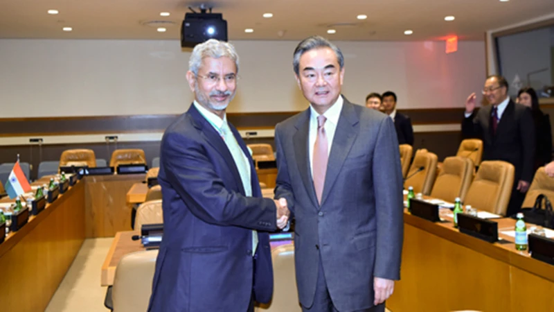 Bộ trưởng Ngoại giao Trung Quốc Vương Nghị (phải) và Ngoại trưởng Ấn Độ Subrahmanyam Jaishankar (trái) gặp nhau ngày 25-9-2019 tại phiên họp Đại hội đồng Liên Hợp Quốc. Ảnh: CGTN
