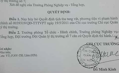 Bất thường nữa là hai ngày sau khi trả hàng, chi cục trưởng Chi cục QLTT Bình Thuận mới ra quyết định hủy quyết định tịch thu, sung công quỹ mà mình đã ký trước đó.