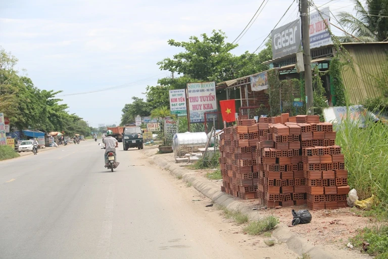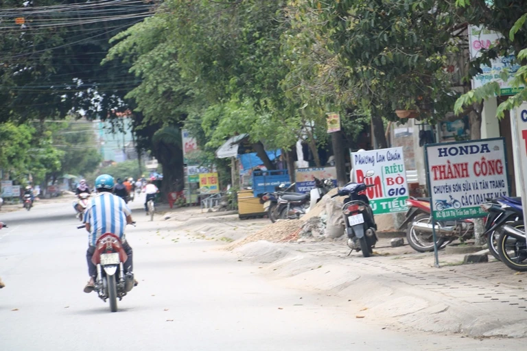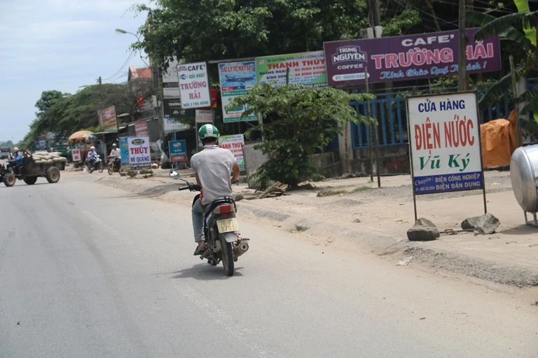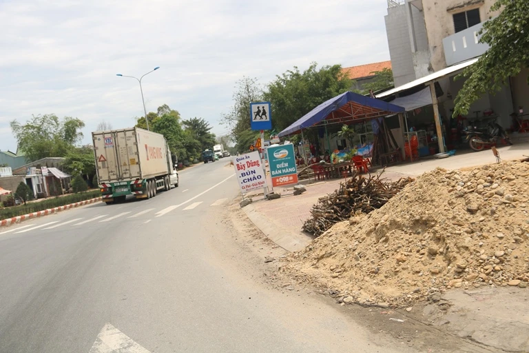 Không những thế, tại đoạn qua huyện Sơn Tịnh cũng không khá hơn. Dọc theo hai bên đường là các bảng hiệu quán cơm, quán bún và nhiều đống vật liệu xây dựng đổ tràn hết vỉa hè dành cho người đi bộ.