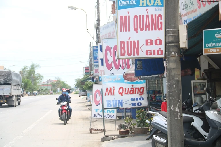 Theo đó, đoạn ngang qua thị trấn Châu Ổ (huyện Bình Sơn, Quảng Ngãi) dọc theo hai bên đường là những hàng quán bán vật dụng gia dụng và các quán ăn uống ngang nhiên chấn ngang vỉa hè, có những đoạn bảng hiệu đặt sát quốc lộ.