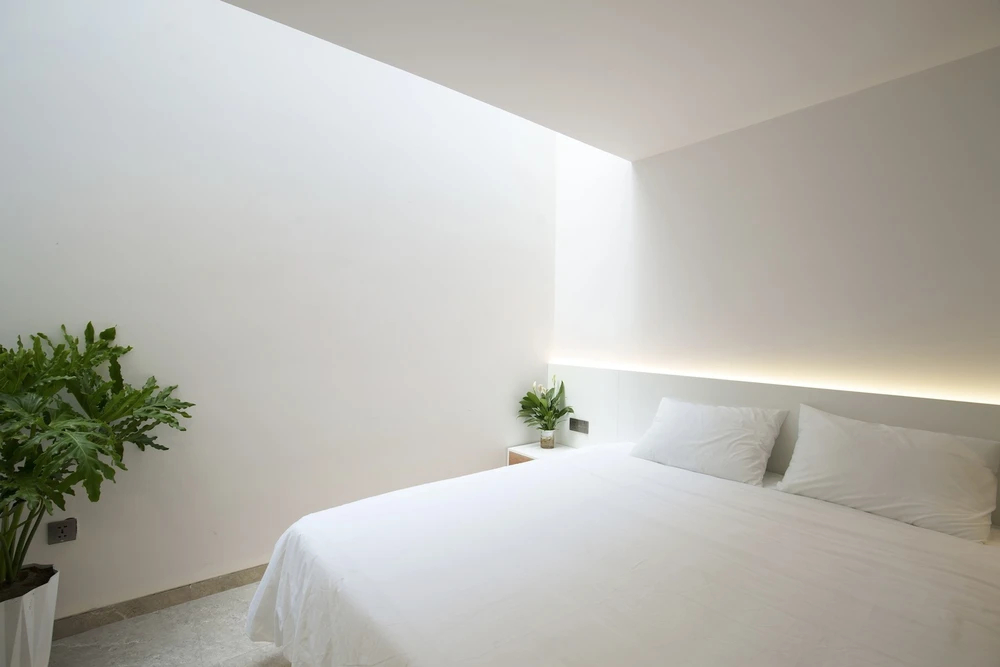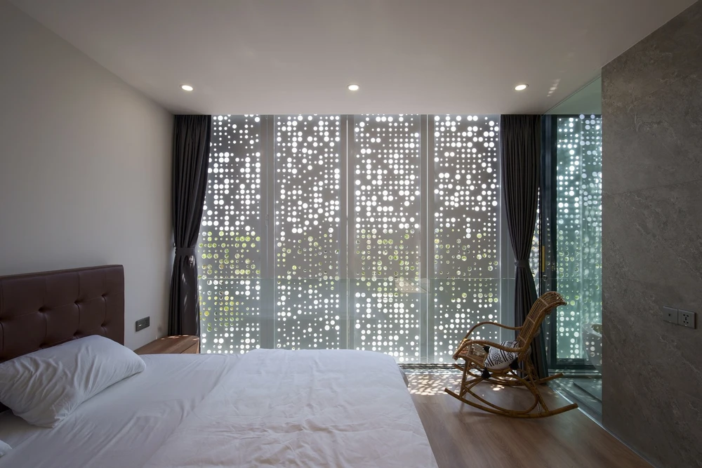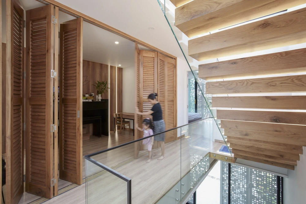 Tuy chiều dài khu đất tương đối ngắn nhưng nhờ sử dụng nhiều giếng trời và cửa tự động lấy sáng nên phòng ngủ và phòng vệ sinh luôn thoáng đãng.