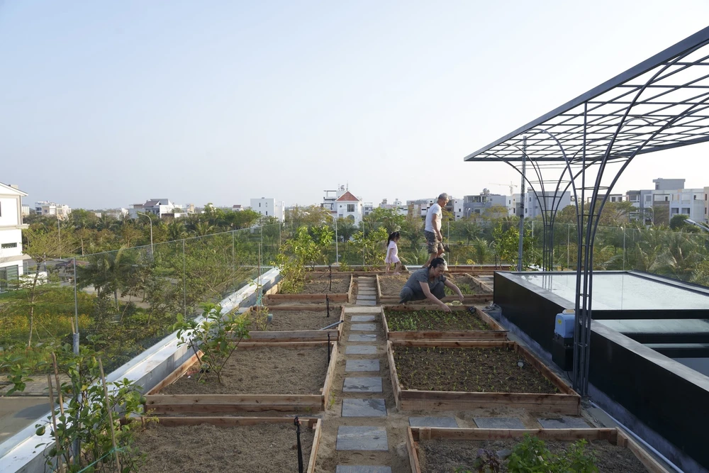 KTS còn sử dụng toàn bộ mái nhà để trồng rau hữu cơ, rau gia vị và cây ăn quả nhỏ. Ngoài ra, vườn rau còn có tác dụng tuyệt vời trong việc chống nóng cho các tầng dưới và chống nứt bê tông.