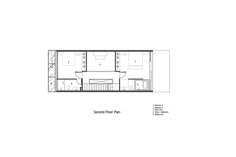 Tầng hai có 2 phòng ngủ, một ở phía trước và một ở phía sau. Ở giữa hai phòng ngủ này là không gian thờ cúng. Cùng với đó là giếng trời lớn để lấy sáng cho hành lang và cầu thang.
