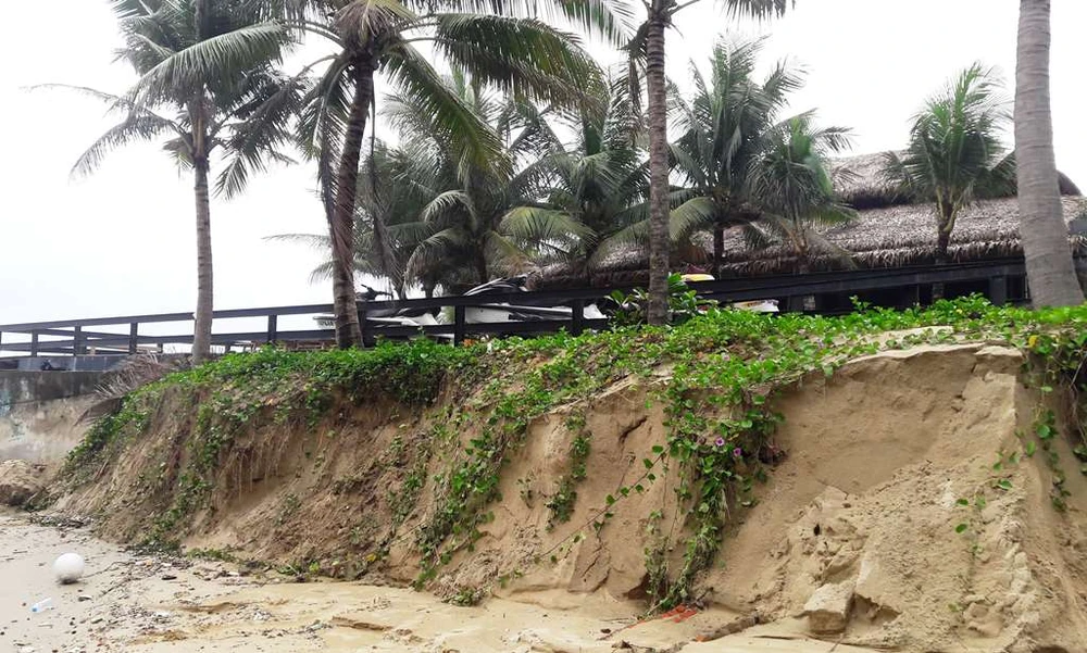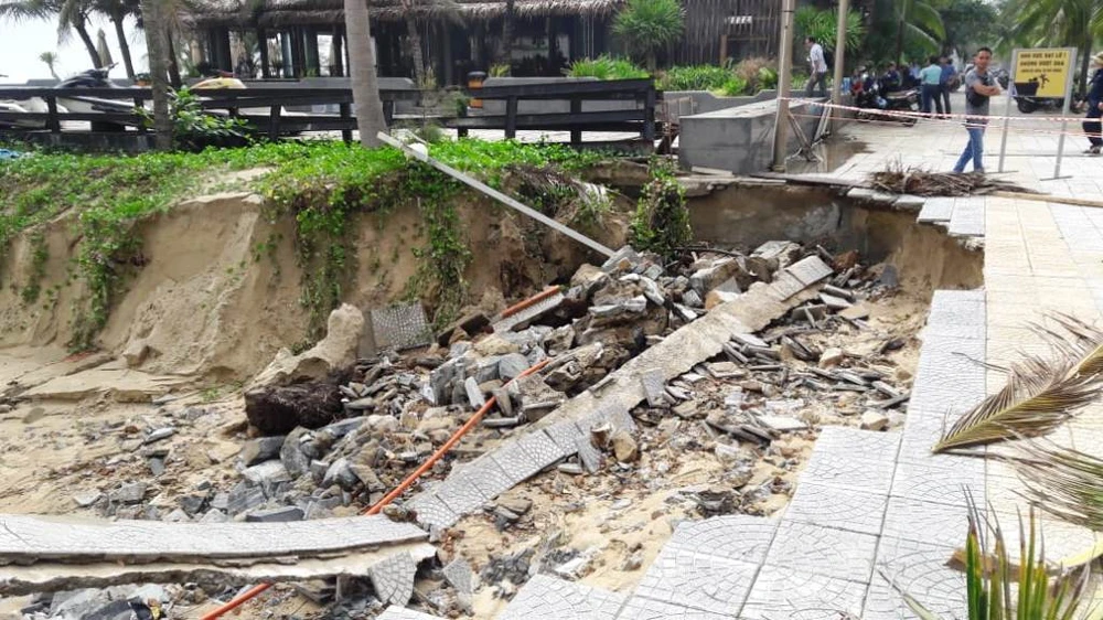 Trước đó, ngày 20-8, cũng tại khu vực trên đã xảy ra hiện tượng sạt lở bờ biển gây xâm thực vào sâu hàng trăm mét. Khu vực bờ kè dài 30 m trên cũng bị cuốn trôi và tạo hàm ếch. Sau đó đơn vị liên quan chỉ tiến hành cho xe múc đất cát biển và cho gia cố tạm thời để tạo cảnh quan.