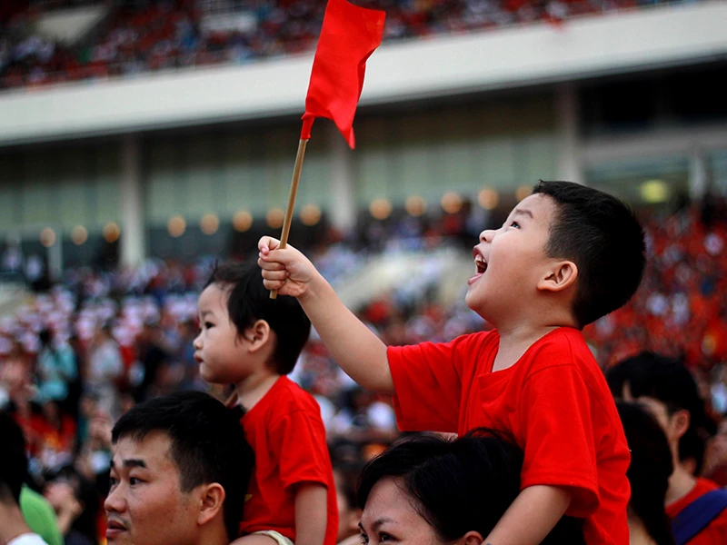 Nhiều em nhỏ được cha mẹ cho vào sân vận động Mỹ Đình để cổ vũ các VĐV. Ảnh: VT