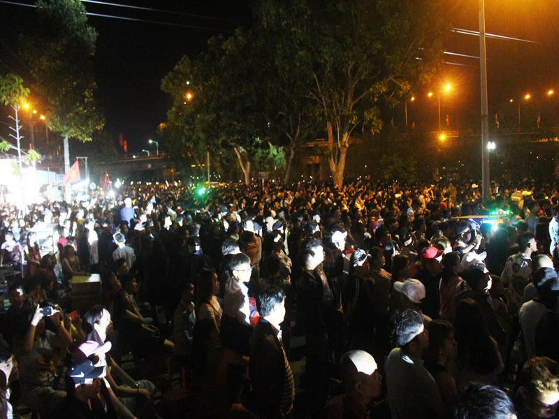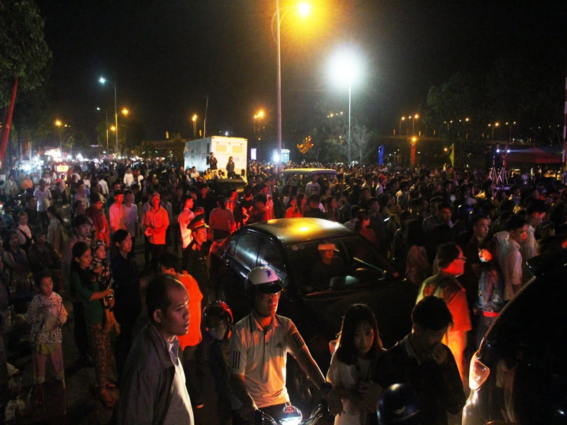 Từ khoảng 22 giờ đêm dòng người đã bắt đầu chen kín con đường Hùng Vương dọc sông Hàm Luông. Chương trình nghệ thuật đón năm mới tại Bến Tre năm nay với chủ đề “Xuân cội nguồn và hội nhập” với nhiều tiết mục đặc sắc, mang âm hưởng mùa xuân tươi mới, rộn rã thu hút người xem.