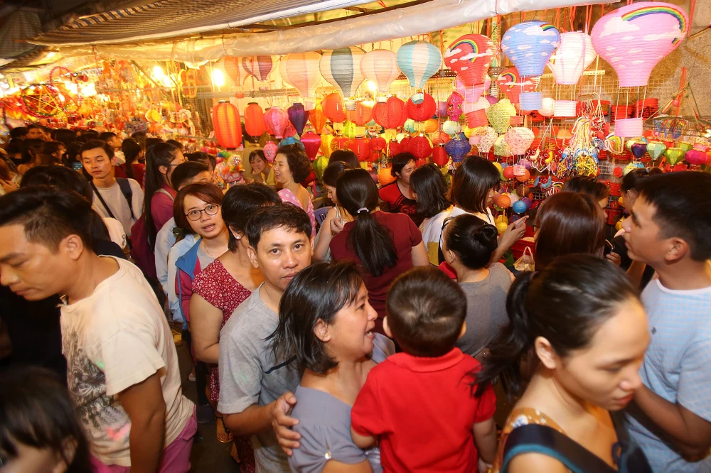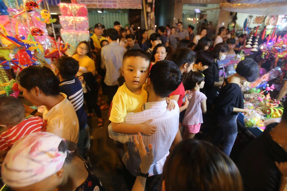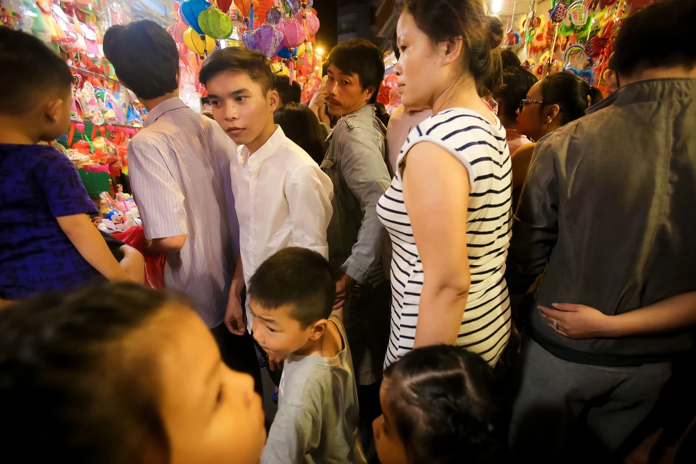 Mọi người nhích từng chút một để có thể di chuyển, những ông bố, bà mẹ đưa con đi chơi Trung thu khá vất vả.