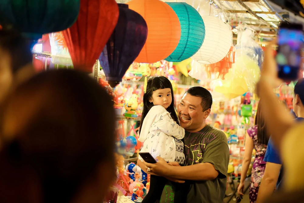 Một em nhỏ được gia đình đưa đi ngắm lồng đèn Trung thu trong buổi tối.