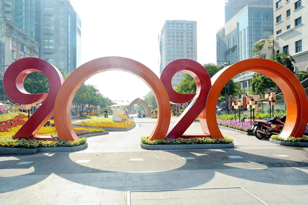 Biểu tượng năm mới 2020 được tạo hình nổi bật giữa đường hoa.