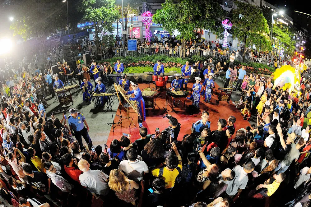 Người dân xem biểu diễn nhạc cụ trong đêm khai mạc đường hoa.