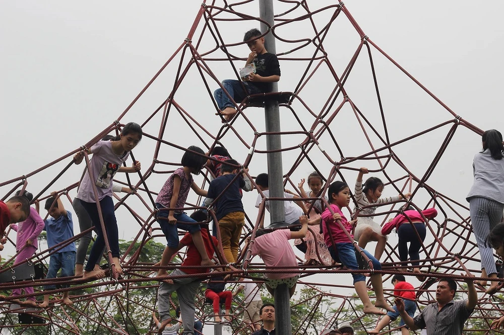 "Mọi ngày chỗ này chỉ có khoảng 4-5 cháu chơi cùng một lúc, nhưng hôm nay có thời điểm lên tới cả hai chục cháu. Biết là sẽ rất đông nhưng nhà gần công viên, cháu lại thích có bạn nên tôi vẫn đưa con ra đây" - chị Bùi Ngọc Thanh (trú tại Bắc Từ Liêm, Hà Nội) cho hay.