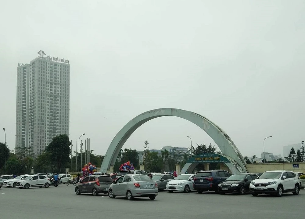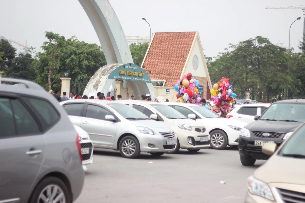 Xe ô tô xếp hàng dài trước cổng công viên Cầu Giấy. Do lượng phương tiện tới đây lớn, giao thông qua các đoạn đường thường xuyên bị ùn ứ cục bộ.