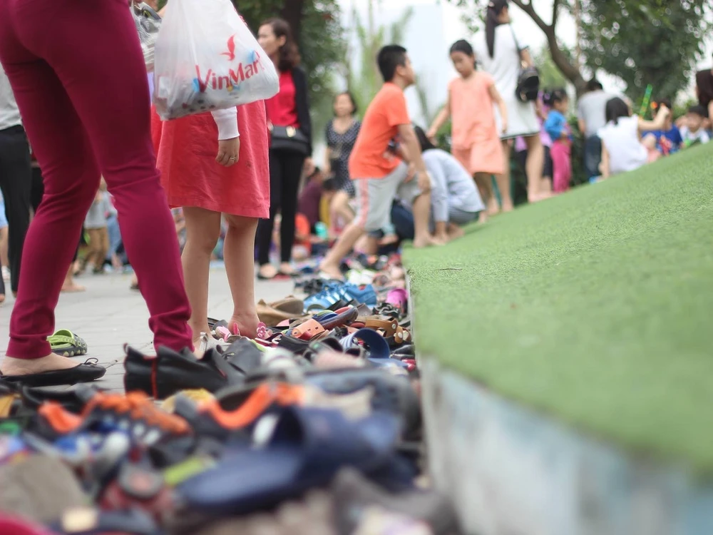 Thảm cỏ tại công viên Nghĩa Đô chật kín giày dép của các em nhỏ