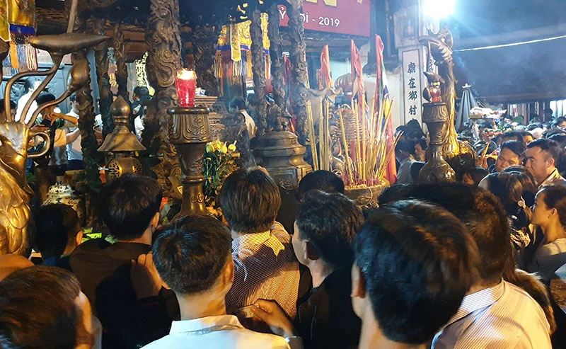 Du khách và người dân cố chen chân tiếp cận để được thắp nén nhang bày tỏ lòng thành tâm dâng lên Đức Thánh Trần cầu mong một năm may mắn. Ảnh: ĐẶNG TRUNG