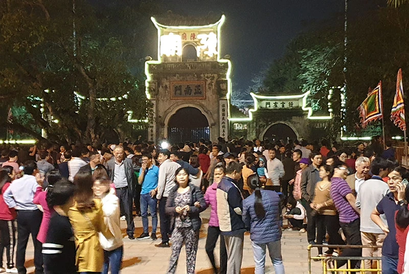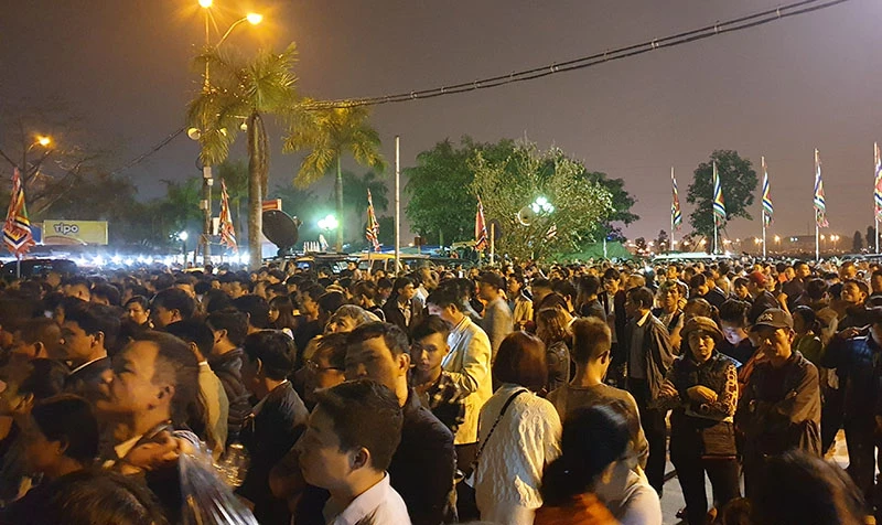 Khoảng 10g đêm ngày 18-2, dòng người từ khắp các nẻo đường đổ về đền Trần chờ được vào đền lễ. Ảnh: ĐẶNG TRUNG