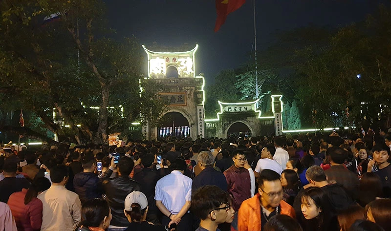 Khoảng 11g đêm cùng ngày, cảnh chen lấn bắt đầu diễn ra, trong khi dòng người tiếp tục đổ về khu vực trước đền Trần. Ảnh: ĐẶNG TRUNG