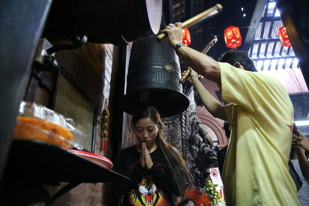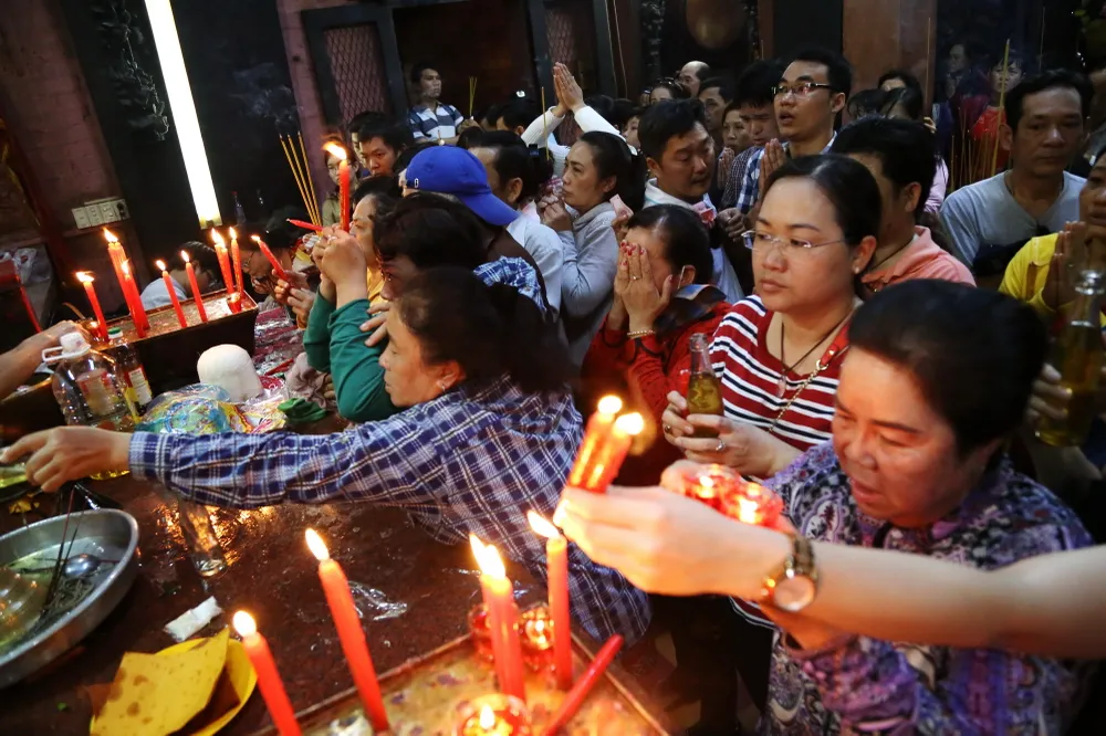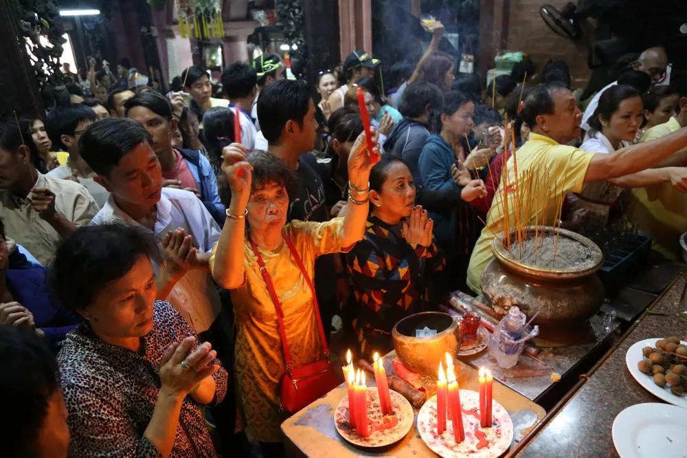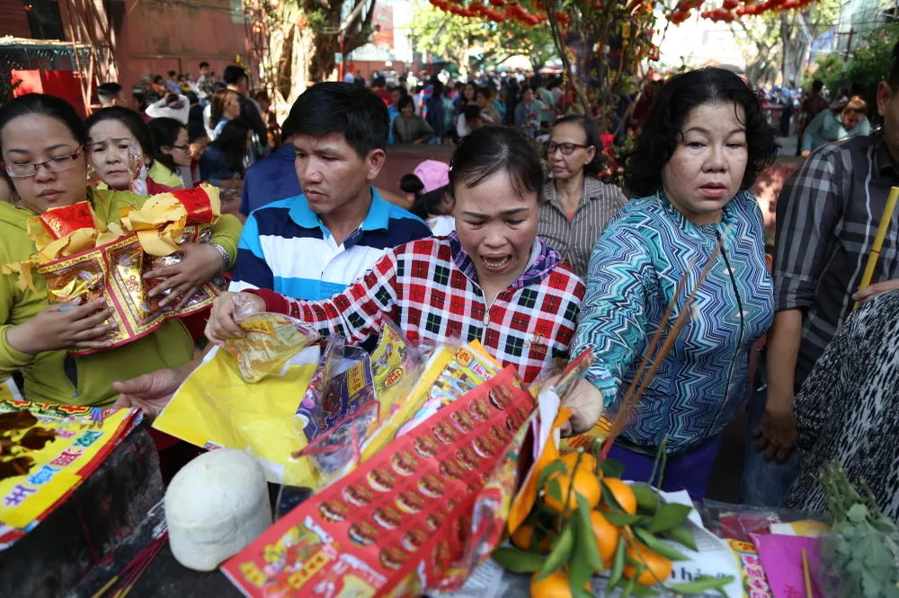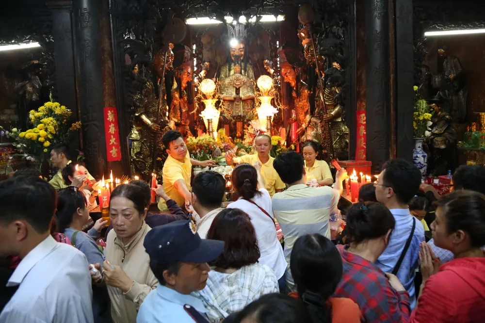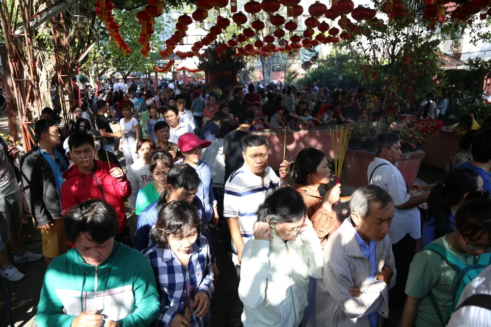 Dòng người tấp nập chen chúc nhau ra vào chùa để cúng chư thiên.