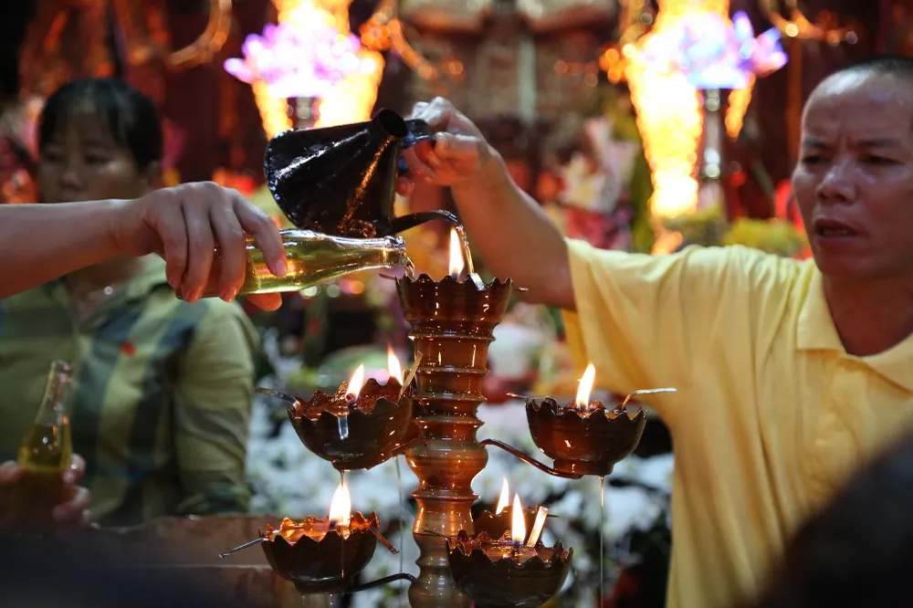 Mọi người chen chúc nhau cúng bái tại điện thờ chính.
