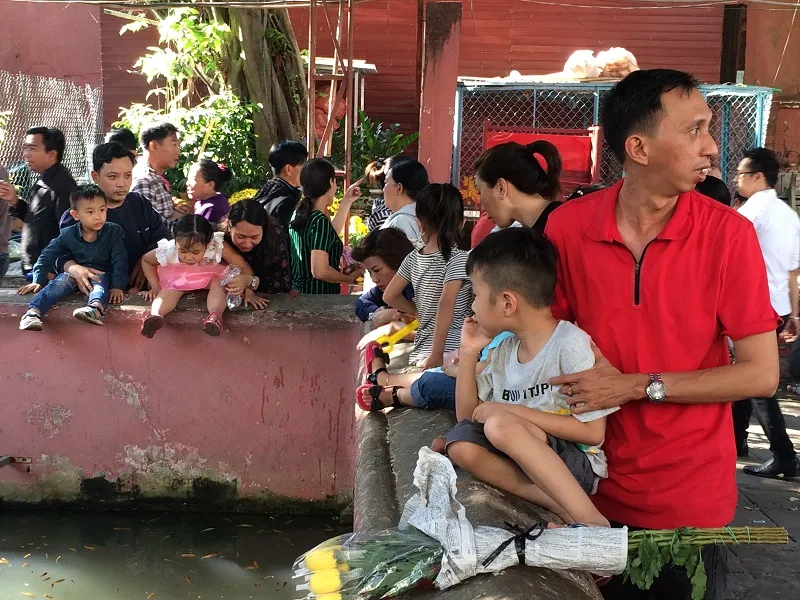 Nhiều trẻ em được cha mẹ cho ngồi lên thành hồ xem cá, rùa.