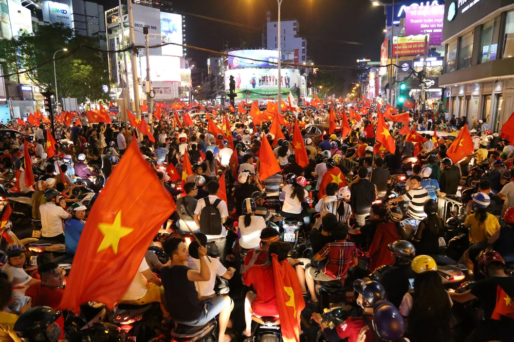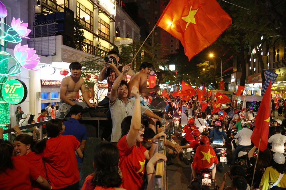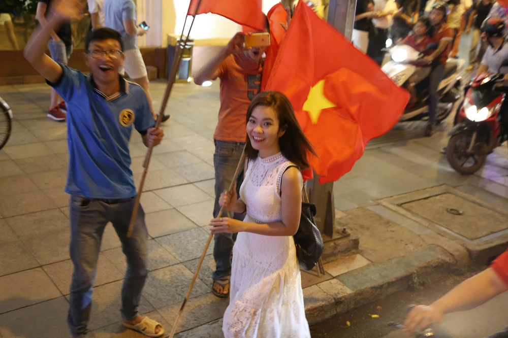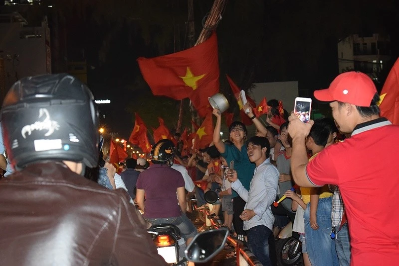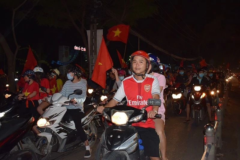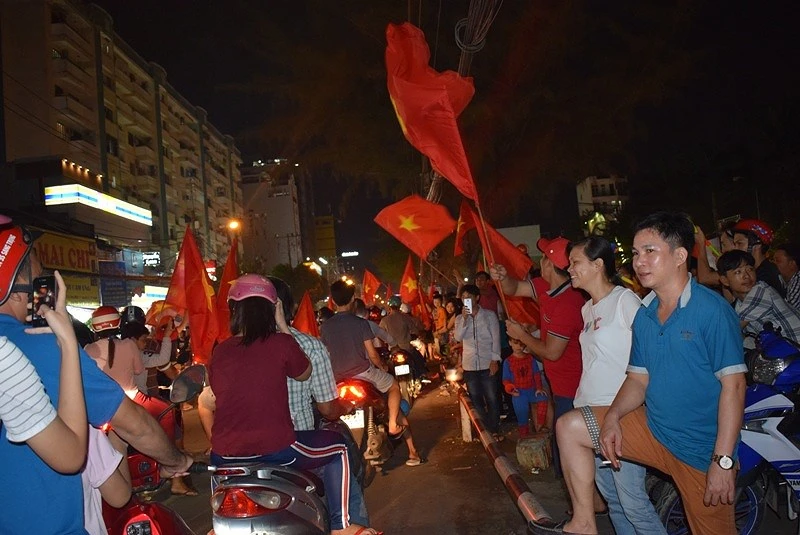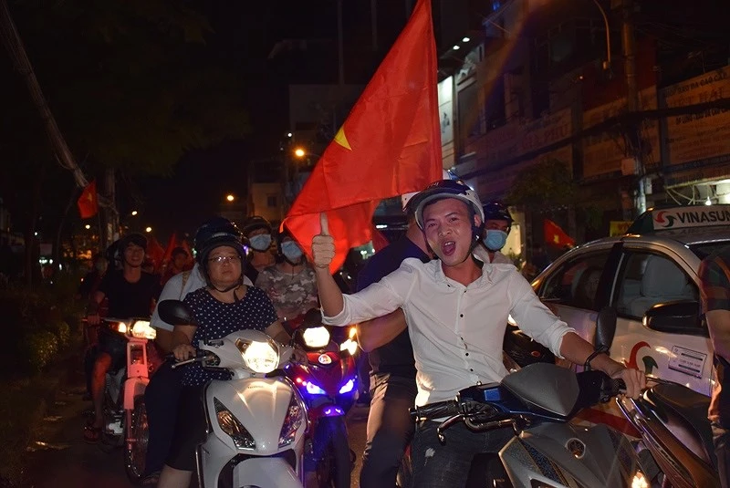 Kết thúc trận đấu lịch sử, hàng ngàn người đổ ra đường với cờ đỏ sao vàng ăn mừng chiến thắng của U23 VN. ẢNH: TRƯỜNG GIANG