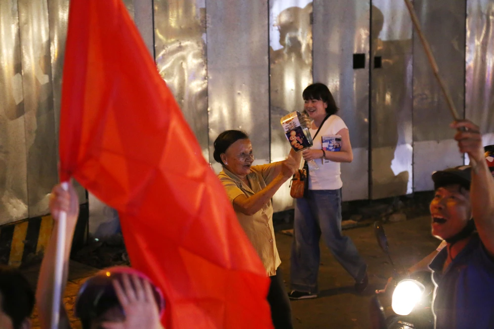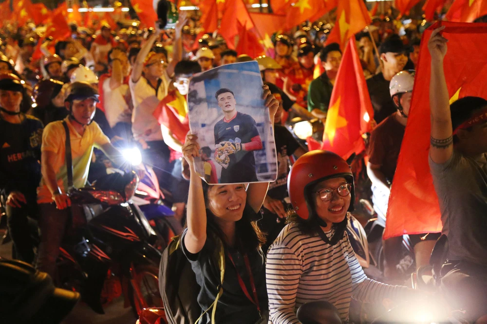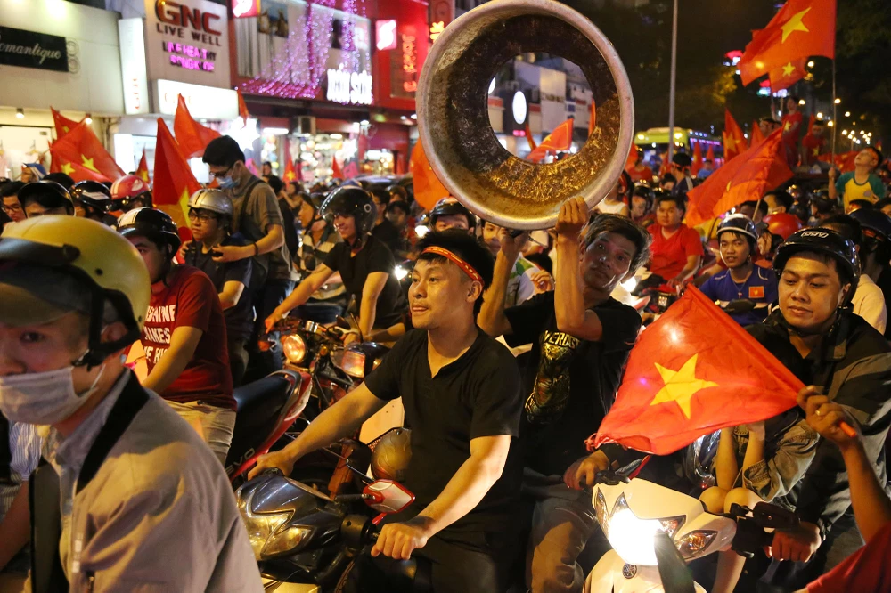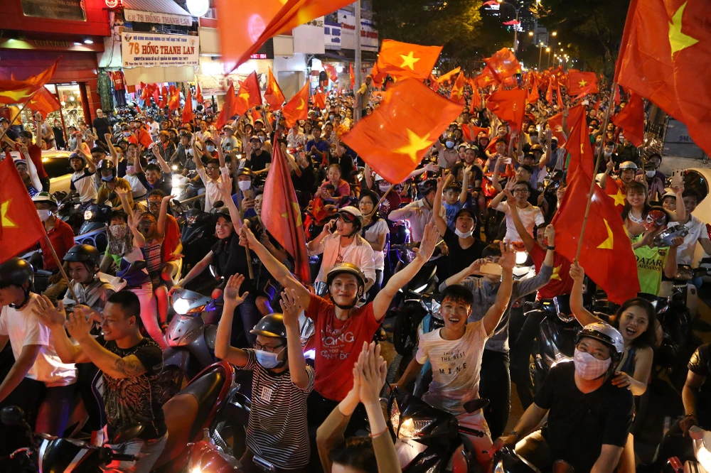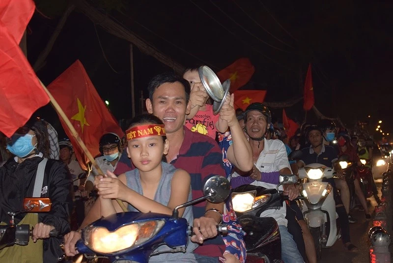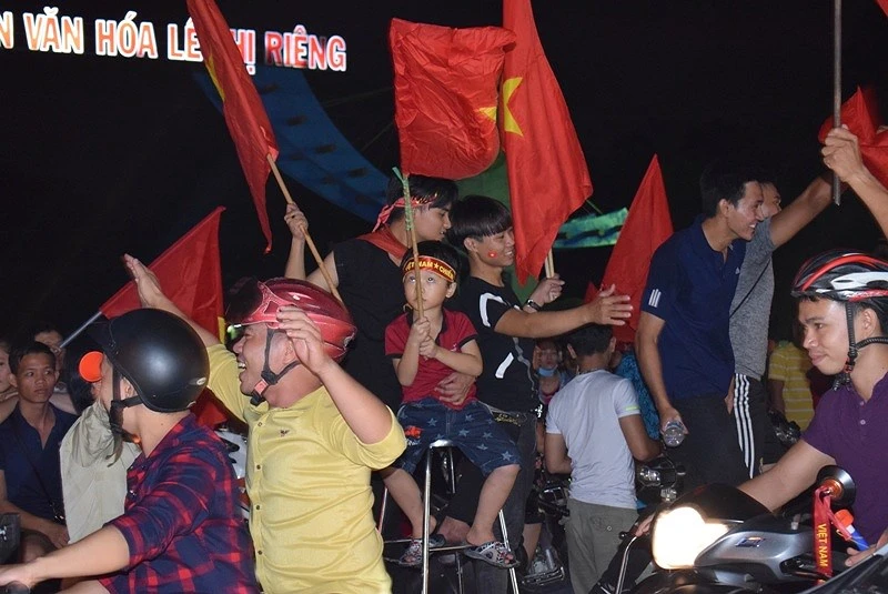Kết thúc trận đấu lịch sử, hàng ngàn người đổ ra đường với cờ đỏ sao vàng ăn mừng chiến thắng của U23 VN. ẢNH: TRƯỜNG GIANG