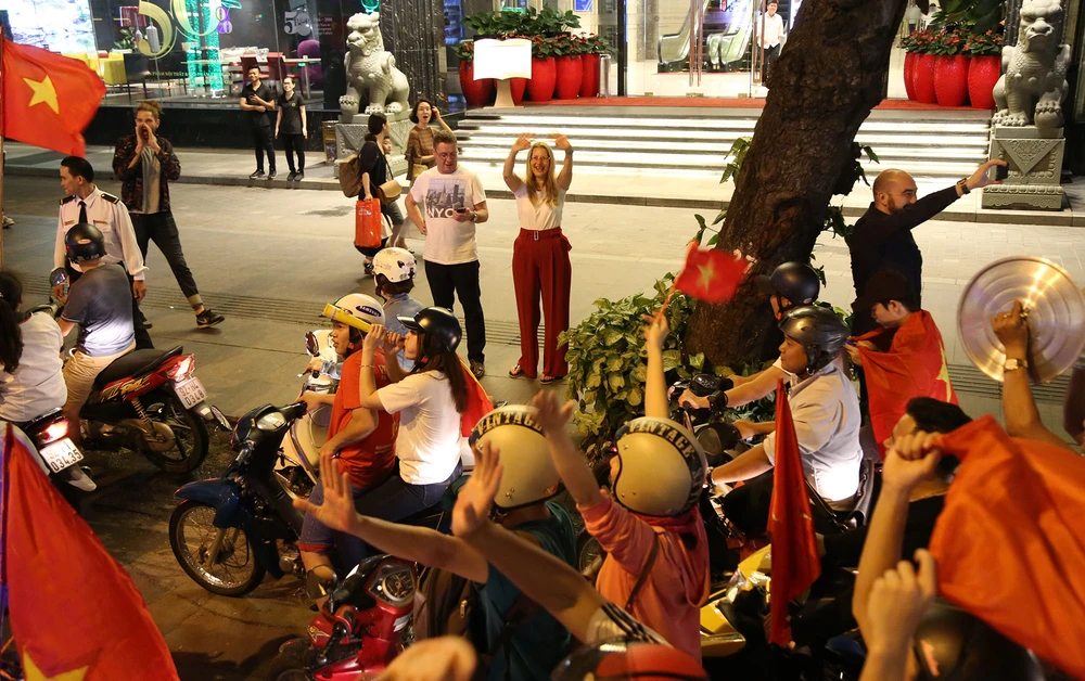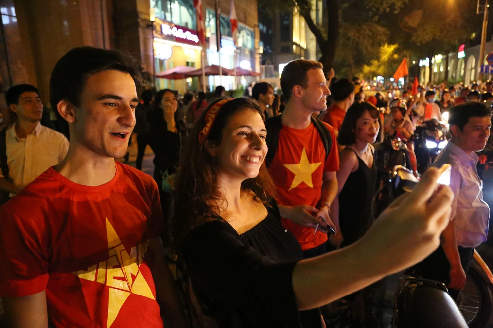 Khách nước ngoài diện áo cờ đỏ sao vàng chụp ảnh khi cùng xuống đường ăn mừng với người dân TP. ẢNH: TRƯỜNG GIANG