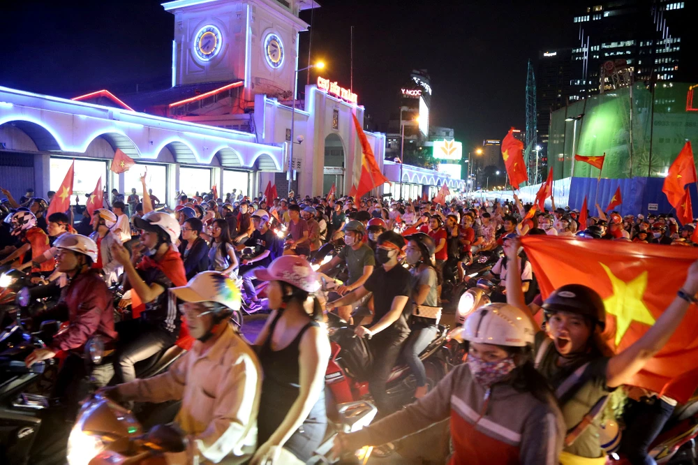 Đến gần 23 giờ không khí ăn mừng chiến thắng tại trung tâm quận 1 vẫn còn rất nóng. ẢNH: TRƯỜNG GIANG