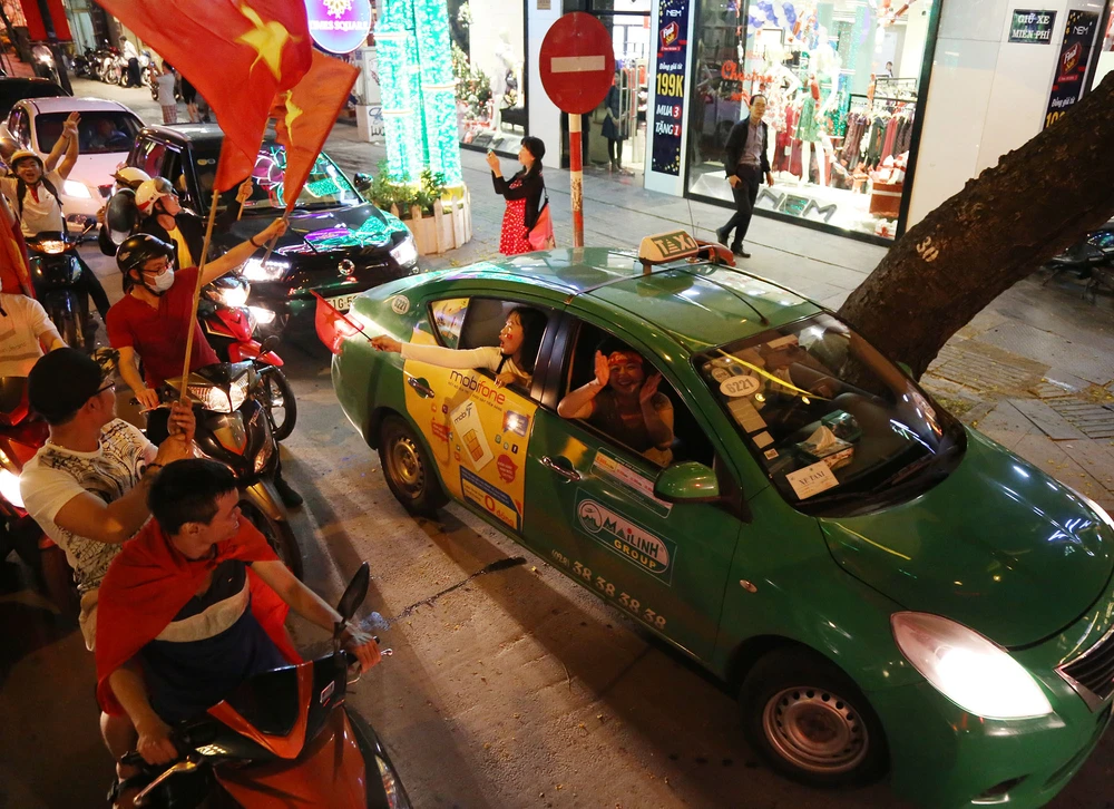 Khách đi taxi hòa cùng vào không khí ăn mừng chiến thắng của người dân TP.HCM. ẢNH: TRƯỜNG GIANG