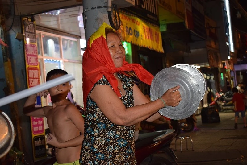Người đàn ông mang thau xuống đường ăn mừng chiến thắng. ẢNH: TRƯỜNG GIANG