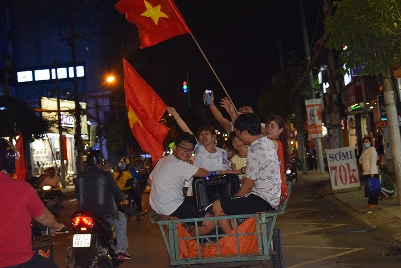 Gần 10 giờ đêm, nhiều con đường vẫn kẹt cứng. Tiếng hò reo “Việt Nam vô địch” vang lên giòn giã.